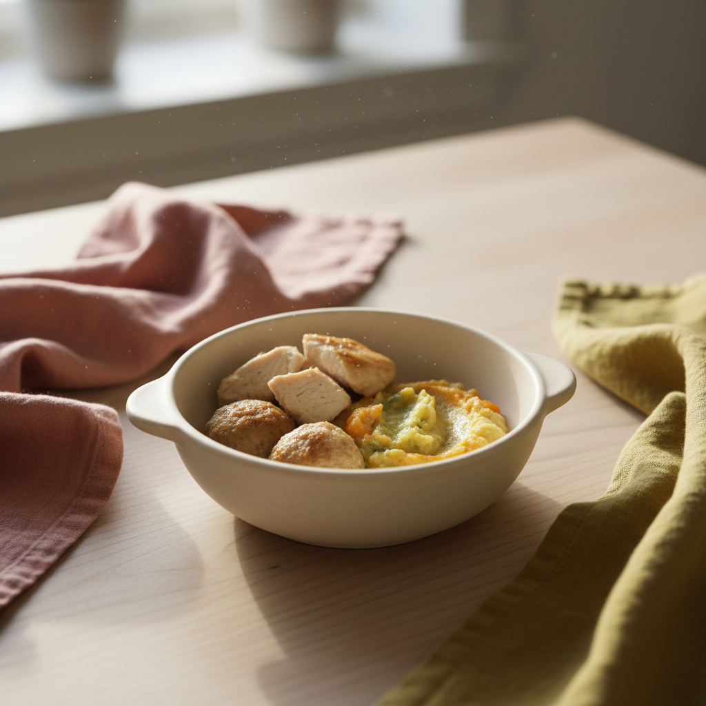 Kjøtt er trygt og anbefalt fra 6 måneder. Start med mager kjøttdeig eller kylling blandet med grønnsaker. Storfe og lam gir mest jern. Unngå bearbeidet kjøtt (pølser, bacon, spekemat) det første leveåret. Server kjøtt med C-vitaminrike grønnsaker for best jernopptak.